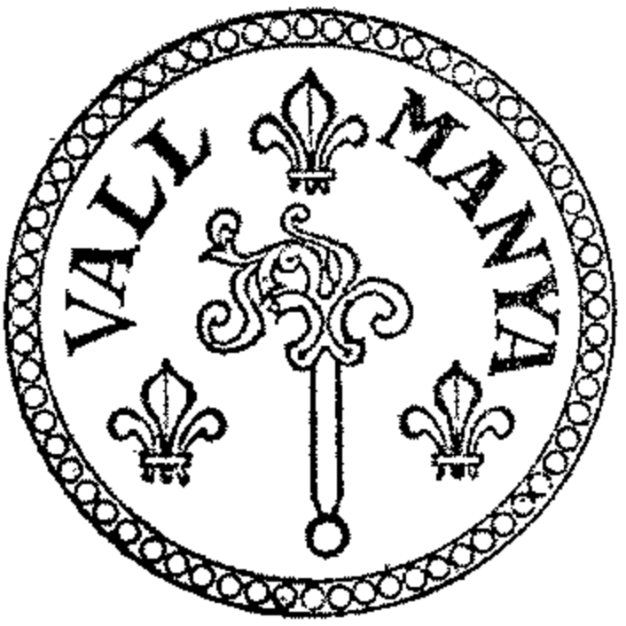 - Les armes représentent la crosse abbatiale entourée des lys de France (après le rattachement à la France en 1659, l’Abbaye de San Miquel de Cuxa avait le titre d’Abbaye Royale) sur un fond de gueule, (rappelant que le Saint patron de VALMANYA, Saint Vincent, diacre, fut martyrisé à Saragosse en Espagne. )