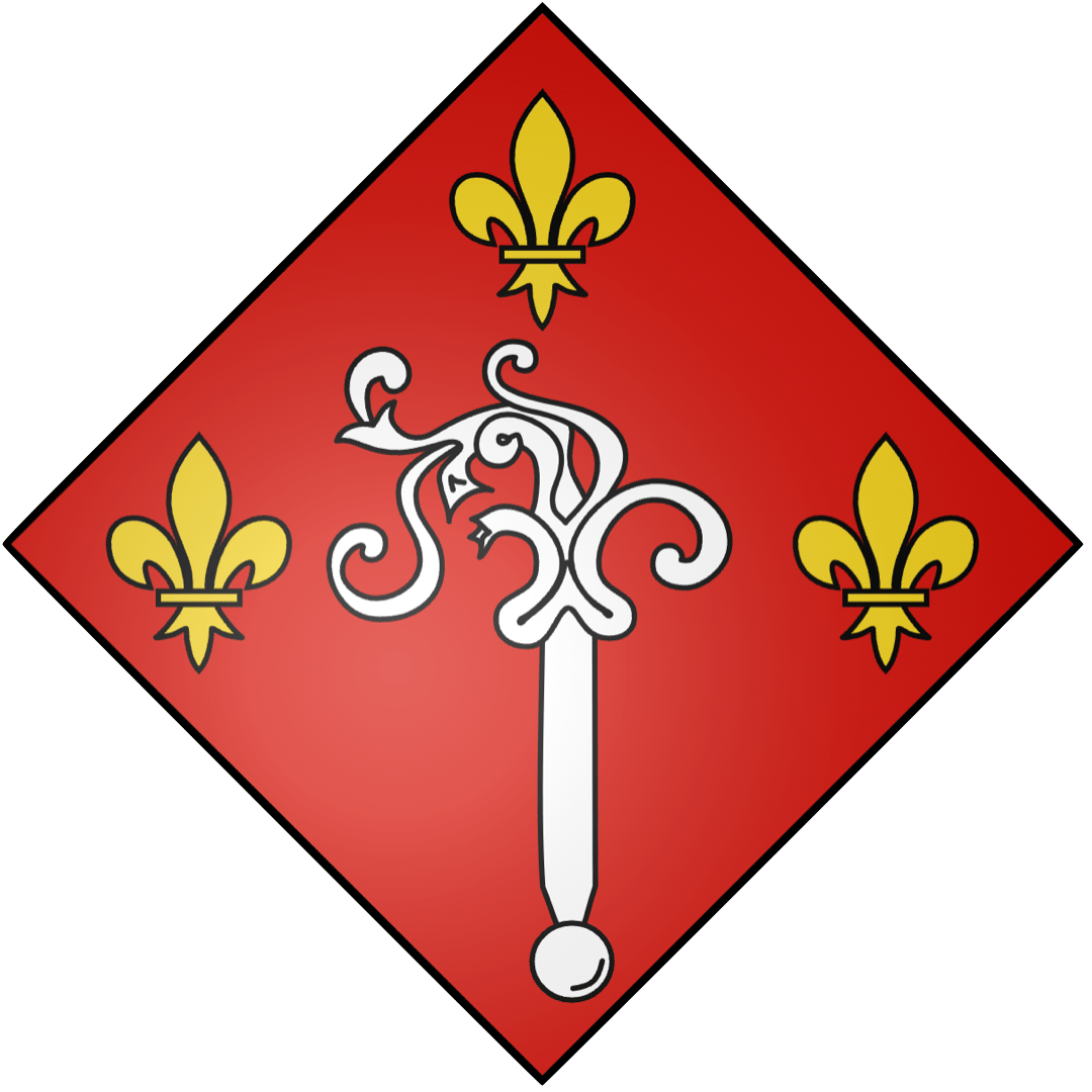 De gueules à une crosse abbatiale d’argent accompagnée à dextre, à senestre et en chef d’une fleur de lys d’or.