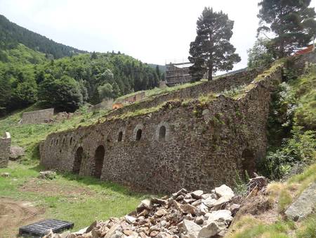 - Le fer extrait de différentes mines, »LA PINOSA » , « LA BATERA » (commune de Corsavy, « LA RABACA » prés du village, ( pour cette mine les archives départementales conservent un acte de concession daté de 1611) la mine des « Cuxars » (actuellement MENER DE L »OR) prés du chalet des Cortalets dans le massif du Canigou, était transporté à la forge à dos d’homme ou avec des mulets. Il était grillé dans des fours pendant plusieurs jours, avant d’être transformé dans le foyer de la forge, chauffé avec du charbon de bois. Le feu était activé par une soufflerie originale constituée par une trompe à eau dite « trompe des Pyrénées ». Cet ingénieux appareil utilisait la force d’un jet d’eau pour produire de l’air comprimé. Le fer incandescent était battu par un marteau pilon mu par une roue à aube, « le martinet »